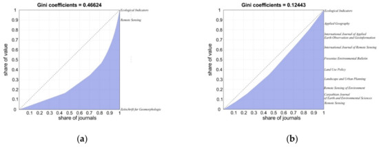 Inequalities of publication sources measured by GINI index: (a): all journals; (b) the 10 top journals.