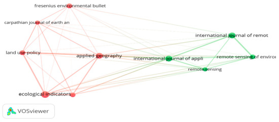 Articles published in the top journals were cited 27.58 times on average, with a considerable influence on further research studies. The journals are bibliographically coupled, which means that articles published make references to the common, previously printed oeuvres, and are grouped in two clusters (Figure 4). The green cluster comprises four journals directly related to remote sensing and published articles stressing those aspects of CORINE land cover that are strongly connected with the interpretation of land cover on satellite imageries. The red cluster gathers five journals with a more diverse scope. Hence, the publications address different types of CLC applications, further discussed in Section 4.