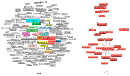 The cooperation of the authors is presented in Figure 6. Scientists dealing with CLC data are grouped in 396 clusters, 31 authors stand alone and did not cooperate with any other researcher. These are the authors who each published exactly one paper on CORINE land cover. 147 publications are the result of a cooperation between only two people, 335 of cooperation between three researchers, usually affiliated with the same institution. Only 25 scientists have cooperated broadly, internationally and nationally, which is highlighted by the frame size (see Figure 5a), their sij index is equal or greater than 25, for five of the authors the total link-strength exceeds 40. The biggest cooperation network is of 54 people, and was formed by Jan Feranec (sij = 48), as seen in Figure 5b. The people he cooperated with are both scientists from the Slovak Academy of Sciences, academics from various European universities and research institutions, as well those from commercial enterprises. Feranec has been involved in the CORINE land cover project from its launch in 1985. He is co-author of CLC nomenclature, from 2001–2009 he joined the Technical Team of central CORINE Land Cover Projects (CLC1990 and CLC2000). His research interests comprise methodology of remote sensing data interpretation, mainly land cover/use and its change mapping, landscape assessment, identification, and analysis of abandonment arable lands and grasslands.