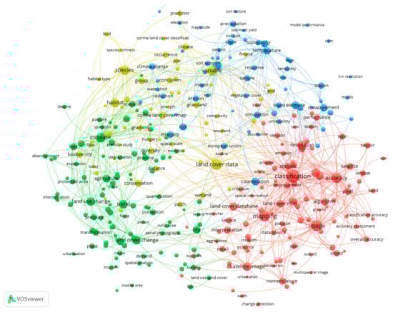 “Classification” is the word that dominates the list of 21,814 terms that were used in the titles and abstracts of the 873 documents. It was used 165 times with 316 total links, and strongly co-coupled (sij = 1891) with such words as: image, mapping, accuracy, spatial resolution, land cover database. Concepts associated with word classification form the red cluster (see Figure 8), which comprises 107 general terms related to the technological and methodological aspect of the CORINE land cover data acquisition, including data accuracy (sij = 1258) and validation (sij = 498). Although these words were used by many researchers, they were prominently observed in publication up until 2011. Words grouped in the green cluster underline the research focused on land cover changes ((sij = 867), land cover trends ((sij = 1918) and their impact on ecosystems and nature (sij = 372). They mainly represent papers published from 2012 until 2014. The yellow cluster includes concepts emphasizing the relatedness of land cover data and habitat types (sij = 209) (spices, birds, vegetation) located in different European regions (e.g., Mediterranean (sij = 169) or Central Europe (sij = 222)). The blue cluster comprises of words (as many as 64) strongly related to advanced geospatial analysis, such as estimation (sij = 665), prediction (sij = 647), simulation (sij = 495), reduction (sij = 451) in the context of climate (sij = 634) and climate change (sij = 554), soil erosion (sij = 375), topography (sij = 386) and its impact on soil loss, precipitation, temperature, and vegetation cover. These words were more prominent in research papers published after 2012.