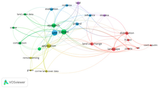 When analyzing words co-occurrence, it is important to pay special attention to words appearing in article titles, as their analysis leads to interesting conclusions. Among 2602 words, only 40 occur in titles at least 10 times (see Figure 9), most of them related to geographical location of application (Europe, Poland, Romania, Slovakia, France, the Czech Republic, and Greece) or data used (land cover data, CORINE land cover data, CORINE, remote sensing). Only a few of these 40 words are related to the kind of application. From a variety of CLC applications, as seen in Figure 10, the publication titles emphasize only landscape analysis, land use changes, climate, and the evaluation of data or result of investigations.