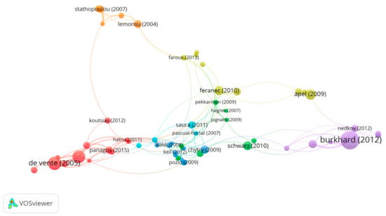 The similarities in the thematic scope of CLC research application are underlined by the bibliographic coupling of authors (Figure 6), which assumes that the more references two authors have in common in their oeuvres, the more similar their research is. Five clusters of scientists working with CORINE LC data are distinguished among those that published five or more papers and were cited at least 10 times each. The green cluster is led by Feranec, and comprises research working on land cover and landscape mapping, namely the dynamics, diversity, fragmentation, and connectivity. Similar scientific research is represented by people belonging to the yellow cluster. This group, however, is limited to research on Mediterranean regions (e.g., Mario Caetano from Portuguese Geographic Institute). The blue cluster groups those whose research pertained to soil erosion, the red cluster emphasizes the remote sources of land cover mapping, while research in the violet cluster is focused on the supply of ecosystem services.