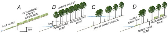 Retreat of coastal forests with rising sea levels has been documented [1,2,3,4]; however, this forest response can be influenced by a variety of circumstances. Storm surges, saltwater intrusion, flooding, and drought can also have a significant effect on these regions [5,6]. Even if these events do not kill trees outright, they can affect saplings that tend to be more sensitive to environmental stressors, thus reducing rates of overall forest regeneration.
