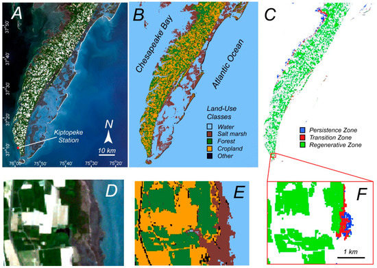 Delmarva peninsula along the East Coast of the USA. (A) Landsat 7 ETM+ C1 level 2 image taken on 4 May 2000; (B) land-use classes obtained with the Random Forest Classifier; (C) classification of persistence zone (forest below 0.92 m of elevation with respect NAVD88), regenerative zone (forest above 1.37 m) and transition zone (between 0.92 m and 1.37 m). (D–F) zoom-in of figures in the zone studied by Kearney et al. [24].