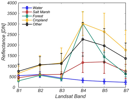 where pi is the proportion associated to the study question. We fix pi to 0.9 for the forest class, assuming that the forest class has an accuracy of 90%, and that only 10% of the forest area is misclassified. Since open water, urban areas, and marshes have a very different spectral signatures compared to forest, while the cropland spectral signature is similar (Figure 3), we assign the remaining 0.1 to the cropland class only, assigning 0 to water, urban areas, and salt marshes. The target standard error of the estimated overall accuracy S(P) is fixed at 0.003, which is in the typical range 0.003–0.005 proposed by Olofsson [33]. We thus obtained a n = 349.16 which we approximate to 330 units (Landsat pixels). This sample size ensures that each stratum has at least 50 samples (Table 2). We assigned more samples to the forest and cropland classes, which cover large parts of the Delmarva Peninsula.