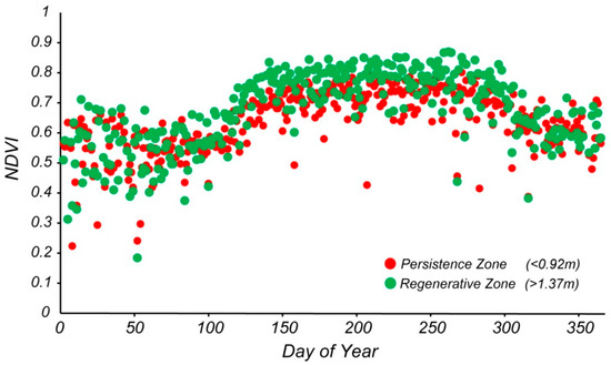 Average Normalized Difference Vegetation Index (NDVI) for all sample points for each day of the year, separated in persistence and regenerative zones.
