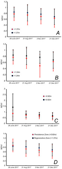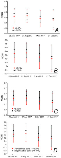 More importantly, the NDVI in the persistence zone below 0.92 m is lower than the value in the regenerative zone above 1.37 m. To determine whether this difference is significant, and whether this difference varies if we change the elevation of the boundaries, we plotted the mean NDVI plus two standard deviations for different zones for four images taken in June, August, November and December of 2017 (Figure 5B). We focused on few selected images to account for the seasonal variability in NDVI within each zone, considering all pixels. Furthermore, we chose the images of 2017 because it was temporally distant from major storms, so the NDVI and NDWI values better represent the long-term forest conditions. We divided the forest based on the three boundary elevations of Kearney et al. [24]: Below and above the maximum sapling elevation of 1.37 m (Figure 5A), below and above the average sapling elevation of 1.24 m (Figure 5B), below and above the lower sapling elevation of 0.92 m (Figure 5C), along with the average NDVI for the zone below 0.92 meters, and the zone above 1.37 m (Figure 5D). The Cohen’s d effect size was computed to determine whether the difference in mean NDVI between these zones was large enough (Table 5). Figure 5A–C and Figure 6A–C represent a sensitivity analysis of the regenerative and persistence zone with respect to elevation.