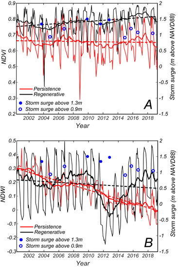 (A) Average NDVI values for persistence zone (below 0.92 m) and regenerative zone (above 1.37 m) for all images. (B) Average NDWI values for persistence zone (below 0.92 m) and regenerative zone (above 1.37 m) for all images. The thick lines are moving averages of 50 Landsat images. The dotted lines are linear interpolations. The highest storm surges during this period are also indicated as blue dots (maximum storm-surge elevation reported on the right y-axis).