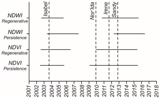 After Nor’Ida in 2009, the NDWI in the regenerative zone started decreasing and kept decreasing when Irene hit in 2011 and Sandy in 2012. After that, the NDWI grew for a period of 4–5 years. A similar trend, although more subtle, is also present in the NDWI of the persistence zone and the NDVI of both persistence and regenerative zones. We, therefore, suggest that forest trees in the regenerative zone were affected by the combination of the three storms, and recovered only 3–4 years after Sandy. In fact, periods of lower NDVI and NDWI ended between summer 2015 and summer 2016 (Figure 8). Periods of lower NDWI in the persistence zone are shifted with respect to period of lower NDVI and NDWI in the regenerative zone (Figure 8). This is probably due to the steep overall decrease in NDWI in the persistence zone, which affects the beginning of the low NDWI periods. These results are in agreement with the tree cores analyzed by Fernandes et al. [31] at a location within our study area. Fernandes et al. [31] discovered that radial growth of loblolly pines is suppressed in the three years after a flooding event triggered by a storm surge. This supports the hypothesis that NDWI is linked to vegetation stress in coastal pine forests, as was already proven in agricultural fields [20,21].
