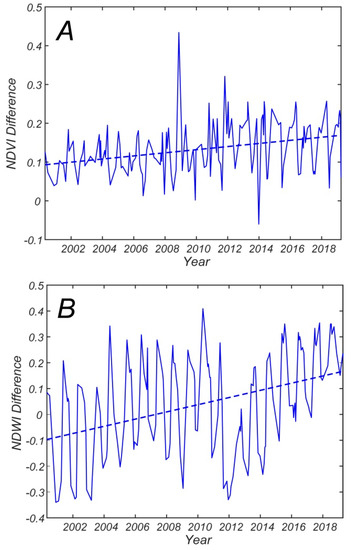 Figure 9A suggests that the difference between NDVI in the regenerative and persistence forest increases over the 2000 to 2019 period; and linear regressions of the yearly averaged values confirm this trend (r = 0.73, p < 0.05). Overall, the NDVI difference almost doubles during the 2000 to 2019 period. Moreover, the difference between NDWI in the regenerative and persistence zones increases over the 2000 to 2019 period, as a linear regression of the yearly average values clearly indicates (r = 0.62, p < 0.05). The maximum differences in NDWI occur in 2010, when NDWI in the persistence zone is quite low in comparison to the NDWI in regenerative zone (Figure 7B), and in 2012, when NDWI in regenerative zone achieves its minimum value over the 2000 to 2019 period (Figure 7B). Overall, the NDWI difference increases more than twice during the 2000 to 2019 period.