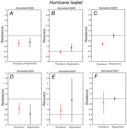 The NDWI resistance index for hurricane Isabel in 2003 is similar in the persistence and regenerative zones (Figure 10A). The NDWI then recovers in the regenerative zone in the following three years but not in the persistence zone (Figure 10B), so that the resilience index is higher in the regenerative zone and equal to one (full recovery Figure 10C). In terms of NDVI, the resistance is slightly higher in the persistence zone (Figure 10D), but the recovery is much higher in the regenerative zone, although it displays a larger yearly variability (Figure 10E). As a result, the resilience index is slightly higher in the regenerative zone (Figure 10F).