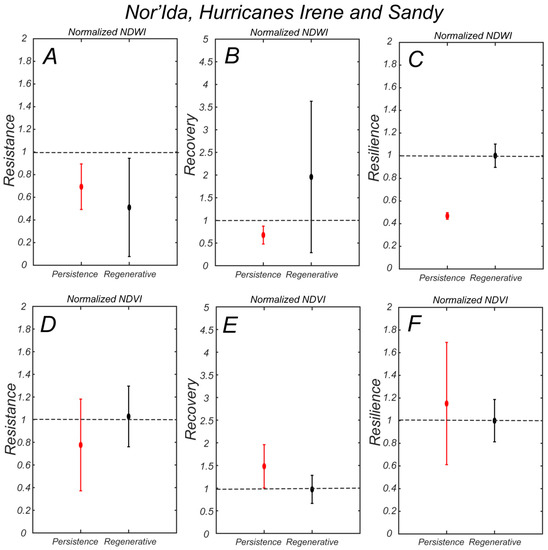NDWI resistance against the combined storms Nor’Ida, Irene, and Sandy is higher in the persistence zone (Figure 11A), while the recovery is much higher in the regenerative zone (Figure 11B), although with a larger temporal variability. As a result, the resilience is higher in the regenerative zone, and again, close to one (Figure 11C). In terms of NDVI, the resistance is higher in the regenerative zone (Figure 11D), while the recovery is higher in the persistence zone (Figure 11E). This results in a similar resilience index in the two zones (Figure 11F).