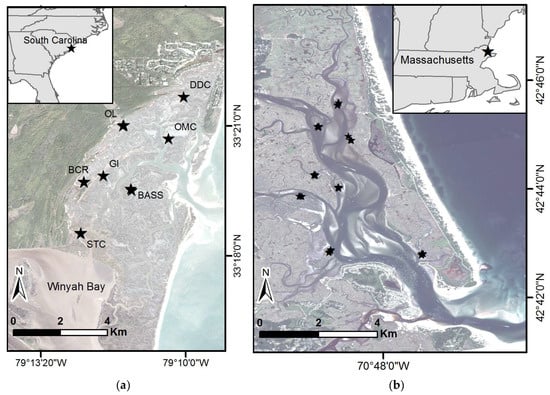 Study areas and sample sites, with stars indicating sample locations. (a) North Inlet-Winyah Bay National Estuarine Research Reserve within South Carolina. Established sample locations names are: DDC—Debidue Creek, OL—Oyster Landing, GI—Goat Island, BASS—Sixty Bass Creek, OMC—Old Man Creek, BCR—Bly Creek, STC—South Town Creek. (b) Study site at the Plum Island Ecosystems Long-Term Ecological Research site within Massachusetts. Basemap images courtesy of Planet Labs, Inc. (San Francisco, CA, USA).
