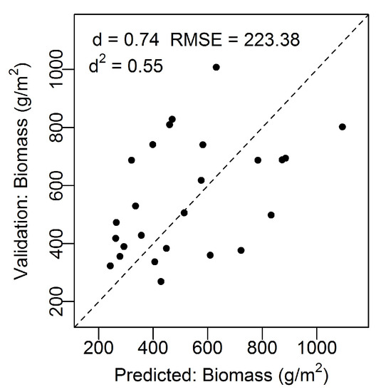 The model accuracy was tested using the independent biomass dataset and there was a good model fit; d = 0.74, d2 = 0.55, n = 26, RMSE = 223.38 g/m2 (Figure 2). The modeled (predicted) values versus the actual values from the validation dataset followed a linear trend that did not significantly deviate from the 1:1 line. Furthermore, the index of agreement was not far from 1 (d = 0.74), indicating a good model fit. The root mean square error (RMSE) of the validation dataset was 223.38 g/m2.
