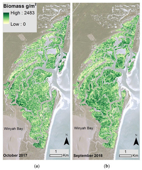 Modeled biomass from the back-transformation of Equation (2) across the marsh landscape at North Inlet from Planet satellite data acquired in (a) October 2017 and (b) September 2018. Basemap images courtesy of Planet Labs, Inc.