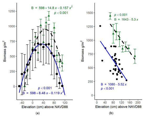 Aboveground biomass (g/m2) versus plot elevation (cm) above NAVD88 within North Inlet and PIE. (a) North Inlet—shown in black are the means (±1 SD) of calculated biomass found at North Inlet across a range of elevations modelled using Equation (2). Biomass predictions shown here were back-transformed by squaring the model calculation. The blue line is a least-squares fit of a parabola (p < 0.001) to these data. Shown in green are the means (±1 SE) from a North Inlet marsh-organ experiment [9] and the least-squares best fit of a parabola. (b) PIE—black circles are (June) harvested biomass samples from this study collected in salt marshes dominated by Spartina alterniflora. The blue regression line indicates dependence of field collected biomass (g/m2) on elevation (cm). Green triangles are means (±1 SE) of end-of-season biomass from in PIE marsh organ experiment [9] with dashed linear regression line.