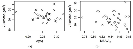 Square-root biomass g/m2 plotted against vegetation indexes within PIE. (a) Visible differences vegetation index (VDVI); (b) modified soil vegetation index 2 (MSAVI2).