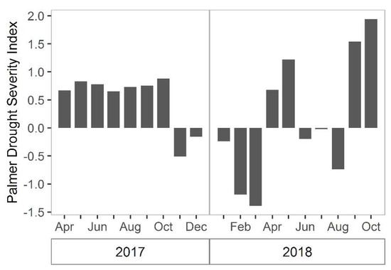 There are other sources of variation that have not been fully explained. For instance, total biomass in 2017 was greater than in 2018, however it is unclear what led to this change. The images used in 2017 and 2018 both were taken at low tide (−0.5 m and −0.42 m relative to NAVD, respectively) and in the same season, so influences of tide and time-of-year were minimal. However, it is possible that atmospheric conditions differed between images and were not perfectly or uniformly corrected using atmospheric correction. Alternatively, rainfall may have been a factor [19,30]. Based on the Palmer drought severity index for the northeast region in South Carolina, 2017 experienced more “incipient wet spells during the growing season than in 2018, which should have been more favorable for growth. Then in February/March of 2018 there was a period of “mild drought” (Figure 7) [49,50], which likely depressed growth. Although there was no notable prolonged drought in 2018, the average summer temperature was slightly cooler in 2017 and springtime wetter than 2018, both of which may have resulted in somewhat more favorable 2017 growing conditions (Figure 8). Other factors that influence aboveground biomass include herbivory, interannual variation in sea level, and storms [19,30,51,52,53]. Thus, the remote imagery has opened up future work on the possible drivers of these inter-annual differences in marsh primary production.