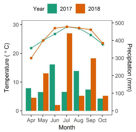 Average monthly temperature (°C) and cumulative monthly precipitation during the growing season within North Inlet for 2017 and 2018. The bar graph indicates precipitation and line graph indicates temperature. Data are from a weather station at North Inlet.