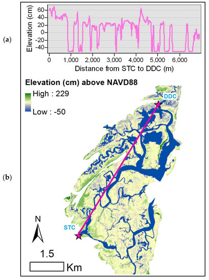 Elevation within North Inlet: (a) Elevation profile across the estuary from the southernmost sample site (STC) to the northernmost site (DDC) and (b) elevation (cm) above NAVD88 with a pink line representing the transect shown in (a).