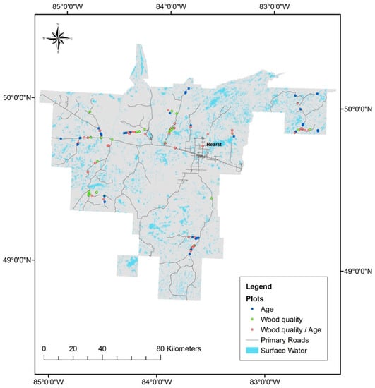 Map of Hearst Forest, with the location of the plots, wood quality project (n = 80), and age prediction model (n = 116).