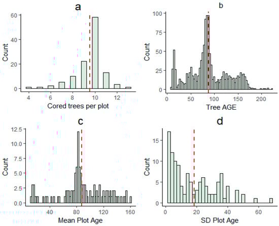 Distribution for final age dataset with mean indicated by red dashed line, (a) the number of trees available per plot n = 116; (b) age distribution of all trees independent of plot n = 1277; (c) mean plot age n = 116; (d) standard deviation of plot age n = 116.