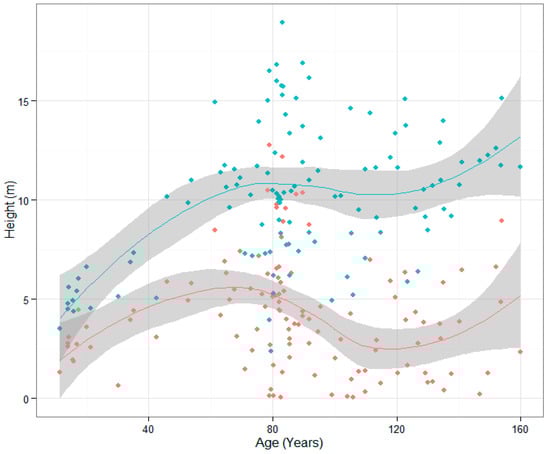 Scatter plot of ALS fifth (P50) in orange and ninth (P90) in turquoise decile height (metres) at plot ages (years) shaded grey is 95% confidence interval. LOESS curves are fit to the distributions.