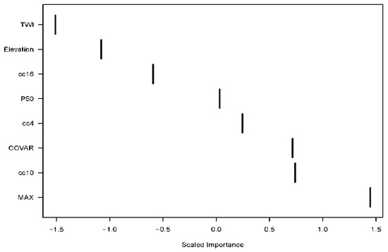 Scaled variable importance for rf-kNN age prediction model of 116 black spruce-dominated plots in the Hearst Forest of Northeastern Ontario.