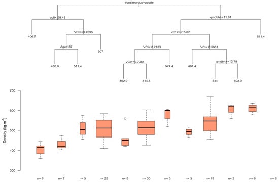 There was a clear separation of density values across the nodes produced in the regression tree analysis (Figure 8). The regression tree model of wood density had a RMSE of 63.87 kg·m−3 and a coefficient of determination of 0.52. Age and ecosite were both important variables in the classification of wood density. The first split in the regression was based on ecosite groups, with EG 3–7 separating into a node where mean densities were typically low (~400–500 kg·m−3) (Figure 8). Mean density within the node containing the wet ecosites (EG-8i and 8p) was higher, with predictions ranging from 450–650 kg·m−3 (Figure 8). Other than the main division represented by ecosite differences, various other predictors formed nodes on the tree within these two branches. On wet ecosites, higher densities were predicted for sites with smaller canopy cover at 12 m and smaller QMDBH, and for sites with higher VCI. On dry ecosites, higher densities were predicted for sites with higher canopy closure at 6 m and higher ages. The lowest predicted density occurred for sites on EG 3–7, with canopy cover at 6 m less than 58%. The highest densities were predicted for sites on EG 8i and 8p, with canopy cover at 12 m less than 15% and QMDBH less than 11.91 cm. Although age was not directly selected in the nodes of the tree that included the wet sites, there was a strong correlation between age and VCI and QMDBH, which were selected variables on those nodes.