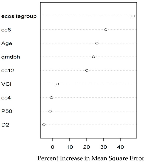 The most important variable extracted in the random forests simulation was ecosite group, which reduced mean squared error (MSE) by close to 50% when it was included in model fitting (Figure 9). Other important variables that reduced MSE substantially (5–35%) were the same variables that were elucidated in the regression tree analysis (e.g., cc6, cc12, age, QMDBH, and VCI) (Figure 9). The variables D2, P50, and cc4 entered the random forests model; however these all had minimal impacts on error when excluded from the model (Figure 9).