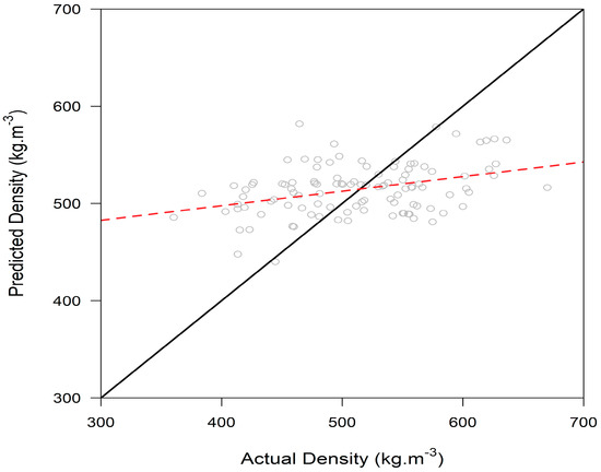 Predicted vs. actual values of wood density (kg·m−3) for random forests model of black spruce wood density for the Hearst Forest of Northeastern Ontario (n = 109). The dashed red line is the line of best fit through the distribution.