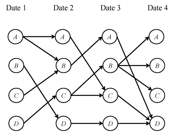 The crop dynamics model can be pictorially represented by a Markov chain as in Figure 2, for four classes () and four dates. Columns correspond to dates and rows to crop classes. Therefore, the nodes represent a crop class on a particular date. The edges identify possible class transitions on adjacent dates. From this graph, we can infer the set of admissible sequences to be evaluated in the computation of Equation (5). In this way, we reduce the number of sequences to be evaluated. As an example, any sequence involving a transition on Dates 2–3 will be disregarded, because there is no edge connecting these classes on Dates 2 and 3.