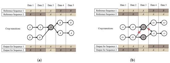 Beyond eliminating sequences inconsistent with the prior knowledge, the method can potentially improve the classification accuracy. However, this simple form of the method still admits wrong solutions since it only enforces consistency over two consecutive dates. Figure 3a shows a simplified example where a wrong solution is not prevented by the aforesaid dynamics model. Let us assume that the only two possible class sequences in the target site are the ones shown in the upper part of the figure (reference sequences). Both sequences consist of class A occurring in three consecutive dates, but shifted in time. Notice that in this example, transition between Dates 2 and 3 and transition between Dates 3 and 4 are permitted. Such a model would allow solutions other than the ones enrolled as admissible. Starting either from class A or class B on Date 1, the possible sequences can contain a wrong temporal path after Date 3, allowing a sequence consisting of class A from Dates 1–5, as well as a sequence with class A only om Date 3 preceded and followed by class B. In both cases, the sequences would be inconsistent with the known crop dynamics.