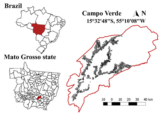 The experimental site was situated in Campo Verde, a municipality in the state of Mato Grosso in the central west region of Brazil (153248S, 551008W) (see Figure 4). The average annual precipitation is 1726 mm, and the average annual temperature is 22.3 C. The major crops found in this area are soybean, maize and cotton. Some minor crops, such as beans and sorghum, are also present. The class Non-Commercial Crops (NCC) includes millet, Brachiaria, and Crotalaria. Other classes present in the dataset are pasture, eucalyptus, uncultivated soil (e.g., bare soil, soil with weeds, soil with crop residues), turfgrass, and Cerrado (Brazilian savanna). The site covers an extension of 4782 km.