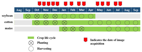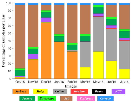 The crop year spans from late August to July with two seeding periods. The phenological cycles of the main crops can span 3–4 months (soybeans and maize) and 4–6 months (cotton). Figure 5 shows the crop calendar for the major crops and illustrates how complex the crop dynamics is in this region. Some crop rotations present in the dataset are soybeans-maize, soybeans-cotton, soybeans-sorghum, soybeans-pasture, soybeans-beans, beans-cotton, and maize-cotton. Figure 6 shows how the area is distributed among different crops along the months. The graph shows that the cycle of the same crop, e.g., soybean, does not start in the same month in all fields, and its duration can also vary from one field to another. As mentioned before, such crop dynamics is characteristic of tropical regions.