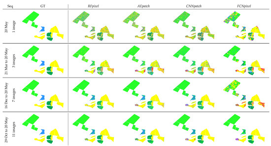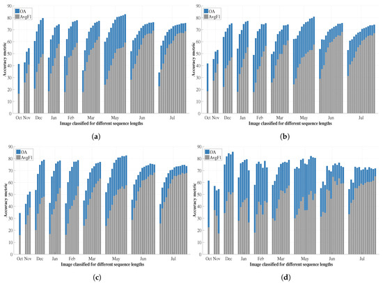 For all methods, the accuracy tended to improve as more multitemporal data were added to the input data sequence, until it stabilized. This trend reflected that the method required some amount of temporal data to achieve its full potential. Additionally, the inclusion of data from outside the crop cycle brought no improvement.