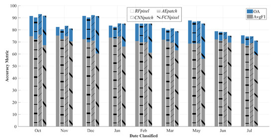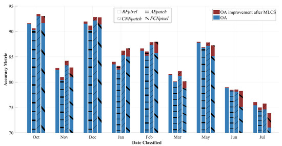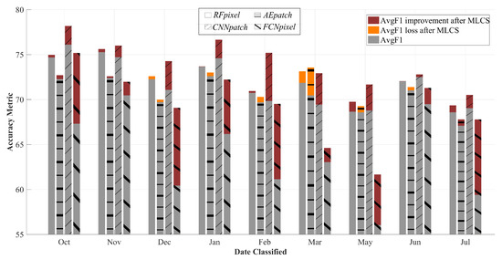 Figure 15 summarizes the results of Figure 11 and Figure 13. As stated before, the enforcement of prior knowledge by MLCS was beneficial on all dates in terms of OA. Similarly, Figure 16 summarizes Figure 14 and Figure 16, whereby in this case, the average F1 score considered all classes. As explained before, the MLCS algorithm tended to smooth the results produced by the classifiers. This effect was detrimental on some dates for some minority classes, whose individual F1 score fell, pushing down the F1 average score. This occurred often with beans, turfgrass, and sorghum.