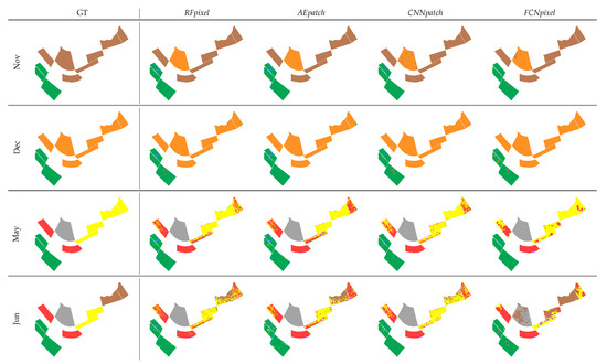 Figure 14 presents the gains brought by MLCS in terms of average F1 score for classes covering at least 2% of the target area, specifically soybean, maize, cotton, pasture, eucalyptus, and Cerrado. Soil was not considered, as it represents a transition between crop classes. Similarly, we disregarded NCC because it encompasses a number of different crop classes. In terms of F1 score, FCNpixel presented the highest improvements, followed by CNNpatch, RFpixel, and AEpatch. Nonetheless, the F1 score decreased slightly in March for RFpixel and more sharply for AEpatch. Looking at the results for each class individually, we realized that MLCS increased the F1-score AEpatch of all classes with the exception of Cerrado, which was responsible for the observed drop in the average F1-score.