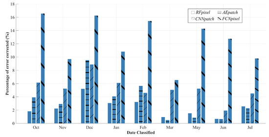 The important thing is to assess how this affects the accuracy. Figure 13 shows the percentage of errors corrected by the MLCS post-processing algorithm in relation to the aforementioned methods for each month. Clearly, the MLCS post-processing brought benefits for all methods. Between 0.5% and 16.5% of the errors produced by each method on different dates were corrected by MLCS. RFpixel and AEpatch were the methods that least benefited from MLCS, whereas FCNpixel consistently presented the highest improvements, followed by CNNpatch.