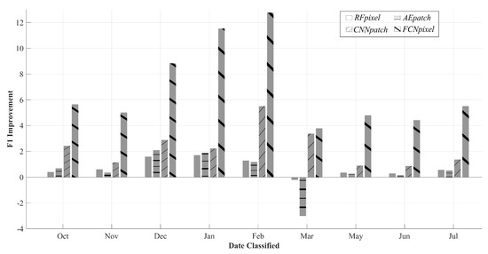 Average F1 score improvement for crops with more than 2% of the total samples of the dataset. From left to right in each bar-group RFpixel, AEpatch, CNNpatch and FCNpixel, respectively.