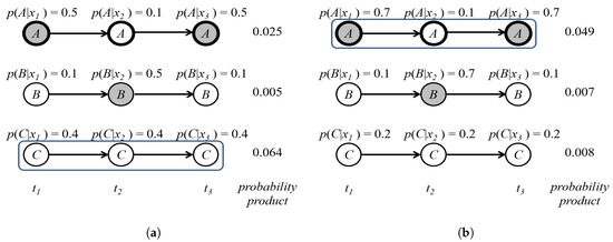 Consider the task of assigning the samples , , and related to the same image site over the dates , , and into one out of three classes (A, B, and C). Let us assume that the sequence AAA is the ground truth (circles with a thick contour), and the posterior probabilities estimated by a generic classifier are shown above each circle in Figure 17. Consider a first approach without MLCS. It consists of choosing the class with the highest posterior on each date. The final result in this case will be ABA (shadowed circles), which corresponds to 67% correctly-classified samples. In a second approach, the posteriors are submitted to MLCS, which discards sequences involving class transitions that conflict with the prior knowledge about class dynamics in the target area. Let’ us assume that AAA, BBB, and CCC are the only admissible sequences, as indicated by the arrows in Figure 17a. The probabilities of each of those sequences is given by the product of the posteriors in each sequence, as shown on the right side of Figure 17a. In this example, MLCS selected CCC (enclosed by a box) as the final solution, classifying erroneously the samples on all dates. Thus, in relation to the first approach, MLCS reduced the accuracy from 67% to 0%. Figure 17b shows a similar example where the posteriors are more concentrated in one class. The first approach predicted classes ABA, as in the prior example. MLCS improved this result and predicted the sequence AAA, which perfectly matched the ground truth. These examples showed that MLCS was generally more effective when the classifiers that estimated the posterior probabilities were more confident in their predictions.