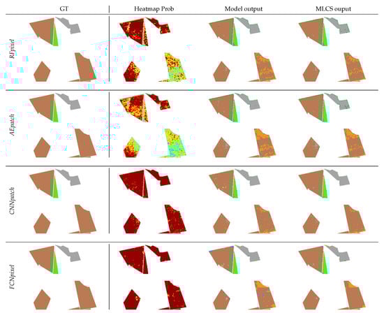 Figure 18 sheds more light on this issue. It presents the classification maps prior to and after MLCS for each tested method for a selected area in February 2016. Figure 18 also presents the probability heat maps for each approach (red: maximum value; yellow: intermediate value; blue: minimum value). The plot shows how MLCS deteriorated the result produced by RFpixel and AEpatch. This was manifested in the increment of class pasture (greenish) within a parcel corresponding to class cotton (greyish). The heat maps in the figure show that these classifiers were not confident about the true class. Contrarily, MLCS improved the results delivered by CNNpath and FCNpixel, which were comparatively more confident about their predictions in the same regions.