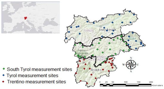 Study area: Tyrol (Austria), South Tyrol (Italy) and Trentino (Italy) and location of the measurement sites.