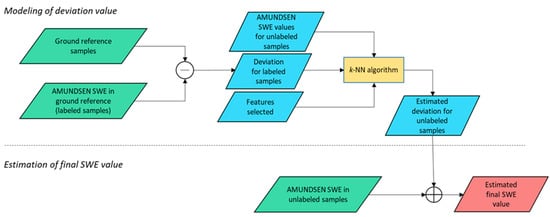 The deviation is defined only for the samples where ground real values are available, hereafter called labeled samples. The characterization of deviation for unlabeled samples (no ground value available) is crucial for generating the new improved SWE product. Thus, the aim of our approach is to characterize the distribution of the model deviation in an automatically identified feature space using the ground observation, and then to estimate the final SWE value for unlabeled samples.