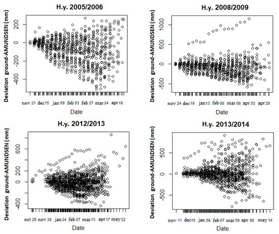 The analysis of the AMUNDSEN simulations helps to understand how the model results vary with respect to the period of the year, the altitude and the different regions included in the study area. This analysis will guide the identification of the training data samples that are representative of the area under study. Figure 4 shows the temporal evolution of the deviations between modelled and observed SWE for labeled samples. The main evidence, observed for all years, is the temporal increase of the spread in the deviations due to the cumulative nature in the SWE variable, so the deviation propagates in time. Table 2 shows the number of points for each year and the relative mean percentage error (MPE), calculated as the ratio between the deviation and the corresponding observed SWE value. The percentage error is a relative error and expresses how large the absolute error (namely deviation) is, compared to the total amount of the measured SWE. The lower maximum value of SWE observed in the hydrological year 2005–2006 is due to lower values of snow depth recorded in this year with respect to the other studied years. It is useful for comparing samples having differing size. In our case, SWE derived from ground measurements (hereafter also called “ground SWE”) can range from few mm up to around 1450 mm, as reported in the last column of Table 2.