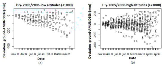 The analysis of the simulated SWE with respect to the altitude for the first study year 2005/2006 is shown in Figure 5 (the other years show similar behavior). By comparing the temporal evolution for altitudes lower than 1000 m and higher or equal to 1000 m, a different behavior can be observed: The distribution of deviation values for lower altitudes seems to be asymmetrical with respect to zero and the simulated SWE is higher (negative values) than the observed one (Figure 5a). This asymmetrical deviation distribution at low altitudes could be due to several reasons such as an error in estimation of the precipitation phase or gradient in the model [32,33], or the non-representativity of the observation sites at low altitudes.