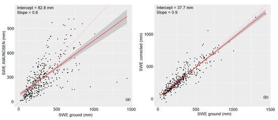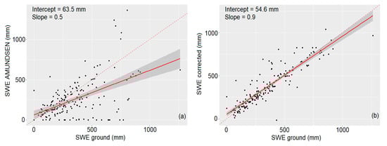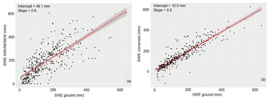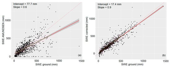 Regression scatterplot for the whole dataset: Simulated SWE vs observation (a) and corrected SWE vs observation (b). The dashed line represents the 1:1 line.