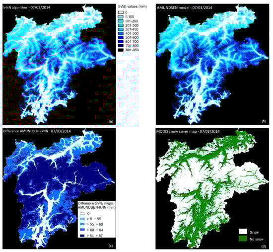 March 7th, 2014: (a) SWE map generated by the proposed method and (b) by the AMUNDSEN simulations. (c) is the difference between the two products and (d) the snow cover map product by MODIS.