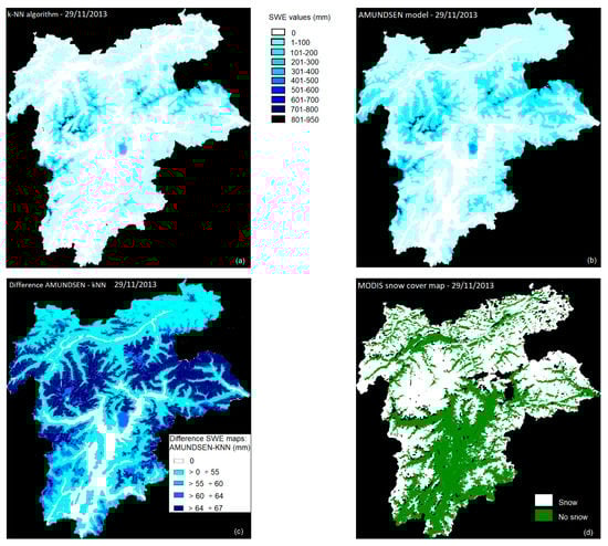 November 29th, 2013: (a) SWE map generated by the proposed method and (b) by the AMUNDSEN simulations. (c) is the difference between the two products and (d) the snow cover map product by MODIS.