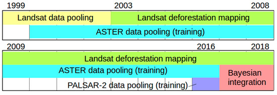 Note that BULC does not integrate the change-detection maps but the land cover maps. In our case, the deforestation maps derived from ASTER and PALSAR-2 were land-cover maps, while those from Landsat were change-detection maps. Therefore, we accumulated the Landsat maps, beginning from the first day to the day of interest. The accumulated maps were assumed to be equivalent to the land-cover maps of forest/deforestation and were positioned together with the maps derived from ASTER and PALSAR-2 in the integration stage. In this sense, once a deforestation event was detected by Landsat, the pixel was assumed to be a permanent deforestation class in the succeeding period. This assumption corresponded to our research scope, where the focus was not on reforestation.